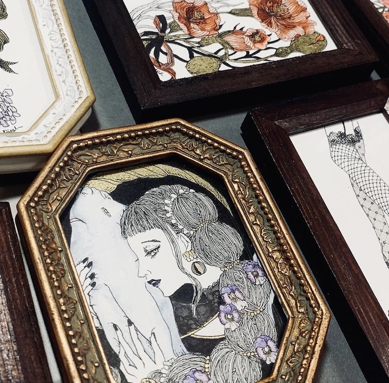 アンダーグラウンドな舞台の陰鬱さと煌めきに魅入られ、その一瞬を求めた世界をペン画と金インクで彩り、描く。